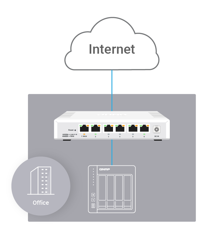 Aby zabezpieczyć zdalny dostęp i zapobiec potencjalnym atakom, zaleca się połączenie modelu QHora-321 przed urządzeniem NAS. Funkcja NAT (ang. Network Address Translation) zapewnia bezpieczeństwo sieci prywatnej poprzez ukrycie rzeczywistego adresu IP używanego w sieci prywatnej przed użytkownikami poza zaporą sieciową.