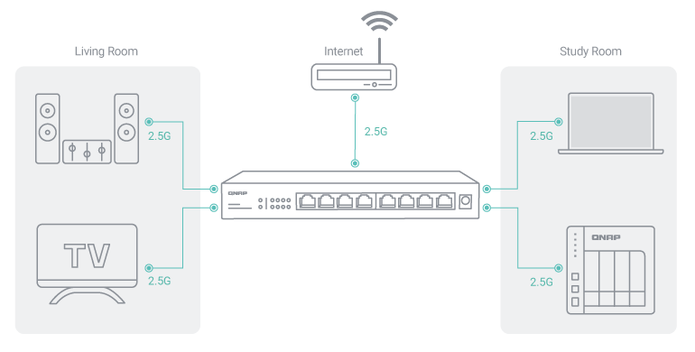 Aby korzystać z modelu QSW-1108-8T, nie są wymagane skomplikowane ustawienia – wystarczy podłączyć urządzenia przy użyciu istniejących kabli Cat 5e i gotowe. Model QSW-1108-8T obsługuje autonegocjację, która optymalizuje szybkości transferu (2,5G/1G/100M) i wydajność dla wszystkich podłączonych urządzeń.