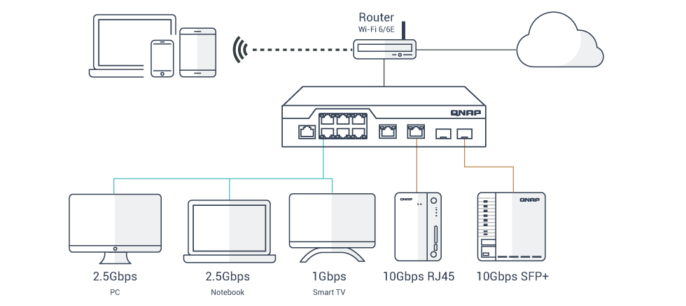 Model QSW-M2106R-2S2T posiada dwa porty 10GbE SFP+, dwa porty 10GbE RJ45 i sześć portów 2,5 Gigabit, umożliwiając podłączanie różnych urządzeń i hybrydową sieć wysokiej szybkości. Dzięki interfejsom SFP+ można użyć kabli miedzianych (DAC) do bezpośredniego podłączenia do urządzeń SFP+. Można także, przy użyciu portów RJ45 podłączać urządzenia 10GBASE-T/NBASE-T™ za pośrednictwem kabli RJ45 kategorii 6a (lub lepszej). Zdolność łączeniowa modelu QSW-M2106R-2S2T wynosi 80 Gb/s, co zapewnia pełny potencjał każdego portu.