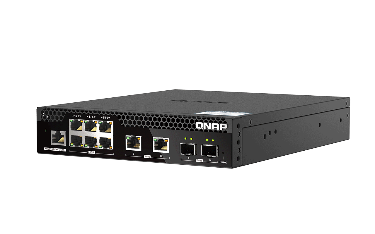 Model QSW-M2106R-2S2T to przełącznik warstwy drugiej zarządzany przez sieć, wyposażony w dwa porty światłowodowe 10GbE SFP+, dwa porty 10GbE RJ45 i sześć portów 2,5GbE RJ45. Model QSW-M2106R-2S2T, obsługuje przełączanie w warstwie drugiej i zarządzanie siecią za pomocą przyjaznego w obsłudze interfejsu WWW, oferuje łatwe wdrażanie w hybrydowych środowiskach sieciowych wysokiej szybkości i stanowi podstawowe rozwiązanie do zarządzania siecią. Dzięki dwukrotnie węższej konstrukcji RACK typu 1U można zamontować dwa modele QSW-M2106R-2S2T, co zapewnia oszczędność miejsca.