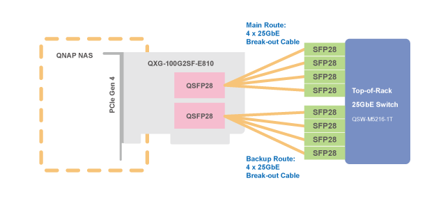 Przy użyciu kabli QSFP28 do (4) SFP28 można łatwo podłączyć cztery porty 25GbE w QSW-M5216-1T do serwera NAS za pośrednictwem dwuportowej karty sieciowej QXG-100G2SF-E810 100GbE. Ustaw grupę połączeń QSFP28 do (4) SFP28 jako główne, a inne jako zapasowe.