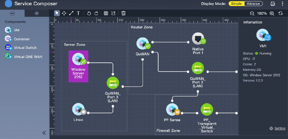 QNE wykorzystuje rozwiązanie QuWAN SD-WAN (niewymagające subskrypcji) firmy QNAP do tworzenia szyfrowanych tuneli VPN z innymi urządzeniami QNAP znajdującymi się w wielu lokalizacjach oraz do tworzenia łańcuchów usług sieciowych w wielu lokalizacjach. Można na przykład automatycznie utworzyć sieć zapory (używając QuWAN i funkcji pfSense VNF) w celu zwiększenia bezpieczeństwa WAN w interfejsie użytkownika Service Composer przy użyciu metody przeciągania i upuszczania.