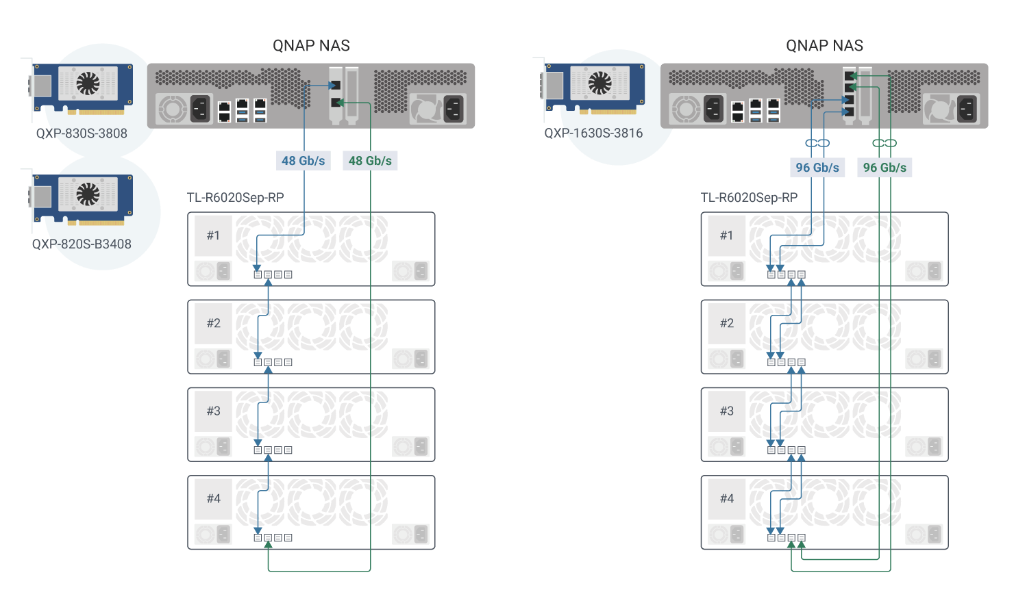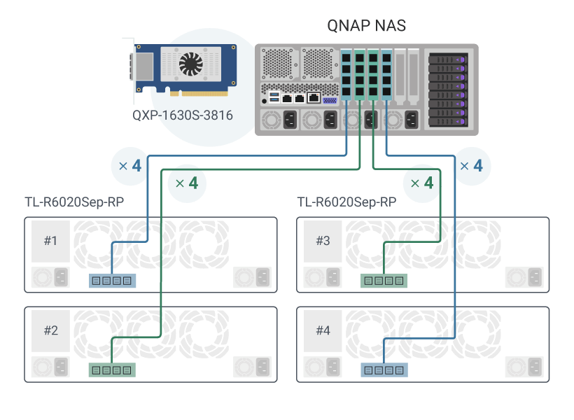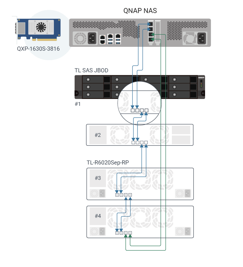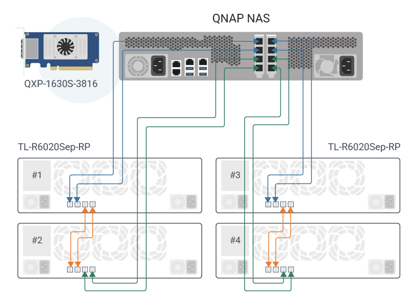 TL-R6020Sep-RP nie jest ograniczony do połączenia szeregowego. Instalując więcej kart SAS Rozszerzenie pamięci masowej w Serwer NAS, można zmniejszyć liczbę pojedynczych klastrów TL-R6020Sep-RP dyski i poprawić ogólną wydajność. TL-R6020Sep-RP może również rozszerzyć istniejący QNAP TL SAS JBOD poprzez dodanie dwóch kolejnych, zwiększając istniejącą pojemność Pamięć masowa do poziomu petabajtowego.