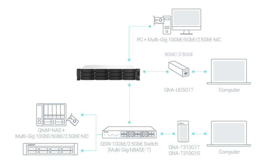 Model TS-1264U-RP idealnie współpracuje z zarządzanymi i niezarządzanymi przełącznikami 2,5GbE/10GbE firmy QNAP, tworząc szybkie, bezpieczne i skalowalne środowiska sieciowe bez przekraczania budżetu. QNAP zapewnia również karty 2,5GbE/5GbE/10GbE PCIe i adaptery USB 5GbE dla stacji roboczych z systemem Windows®/Linux®, co pozwala łatwo zbudować szybkie środowisko sieciowe do produktywnej współpracy zespołowej.