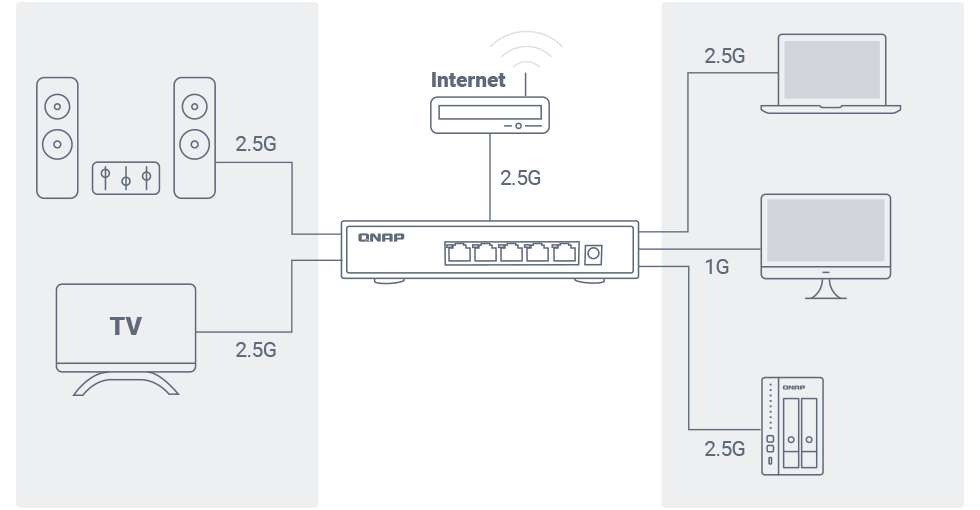 Modernizacja sieci nie powinna wiązać się z wielkimi kosztami, a łączność 2,5GbE zapewnia zauważalną poprawę w porównaniu ze standardową łącznością 1GbE. QNAP oferuje przełączniki 2,5GbE z obsługą Multi-Gigabit NBASE-T™ i umożliwia połączenia przy użyciu istniejących kabli CAT5e z wieloma komputerami i serwerem NAS, pomagając organizacjom wdrażać bezpieczne środowiska sieciowe wysokiej prędkości, z możliwością rozbudowy, bez przekraczania budżetu.