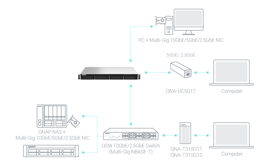 Model TS-464U idealnie współdziała z zarządzanymi i niezarządzanymi przełącznikami 2,5GbE/10GbE firmy QNAP w celu uzyskania wysokiej szybkości, bezpiecznego środowiska sieciowego z możliwością rozbudowy, nie przekraczając budżetu. QNAP oferuje również karty PCIe 2,5GbE/5GbE/10GbE oraz adaptery USB 5GbE dla stacji roboczych z systemem Windows®/Linux®, dzięki czemu można łatwo zbudować środowisko szybkiej sieci na potrzeby produktywnej współpracy zespołowej.