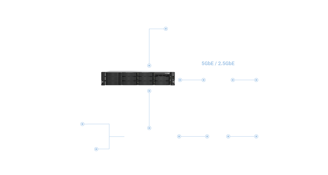 Model TS-855eU-RP, wyposażony w dwa porty 2,5GbE RJ45 LAN (wstecznie kompatybilny z 1G/100M), pozwala firmom na łatwe zwiększenie szybkości sieci z 1 Gigabit do 2,5 Gigabit przy użyciu istniejących kabli CAT5e. Obsługa trunkingu portów i przełączania jeszcze bardziej wspiera aplikacje wymagające wyższej przepustowości i niezawodności, takich jak wirtualizacja, przesyłanie dużych plików, szybkie tworzenie kopii zapasowych/odtwarzanie oraz aplikacje działające w czasie rzeczywistym. Firma QNAP oferuje także liczne zarządzane i niezarządzane przełączniki 2,5GbE/10GbE, zapewniając organizacjom wsparcie we wdrażaniu wysokiej szybkości, bezpiecznych i skalowalnych środowisk sieci, nie przekraczając budżetu.