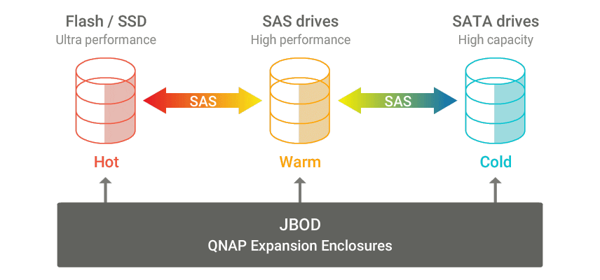 Model TS-864eU obsługuje pamięć podręczną SSD, poprawiającą przepływ wielu losowych operacji wejścia/wyjścia, takich jak wirtualizacja. Technologia Qtier™ umożliwia korzystanie w serwerze TS-864eU z automatycznego pozycjonowania danych, które nieustannie optymalizuje wykorzystanie pamięci masowej na dyskach SSD i SATA o dużej pojemności. Technologia Qtier™ 2.0 zapewnia wiedzę o procesach wejścia/wyjścia, która wzbogaca pozycjonowaną pamięć masową SSD o podobną do pamięci podręcznej zastrzeżoną przestrzeń w celu obsługi zwiększonej liczby operacji wejścia/wyjścia w czasie rzeczywistym, maksymalnie zwiększając korzyści z dysku SSD.