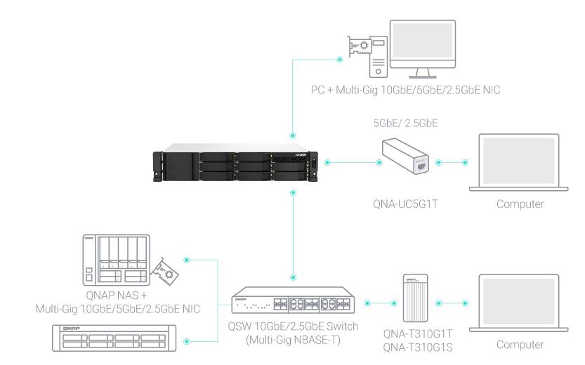 Model TS-864eU idealnie współdziała z zarządzanymi i niezarządzanymi przełącznikami 2,5GbE/10GbE firmy QNAP w celu uzyskania wysokiej szybkości, bezpiecznego środowiska sieciowego z możliwością rozbudowy, nie przekraczając budżetu. QNAP oferuje również karty PCIe 2,5GbE/5GbE/10GbE oraz adaptery USB 5GbE dla stacji roboczych z systemem Windows®/Linux®, dzięki czemu można łatwo zbudować środowisko szybkiej sieci na potrzeby produktywnej współpracy zespołowej.