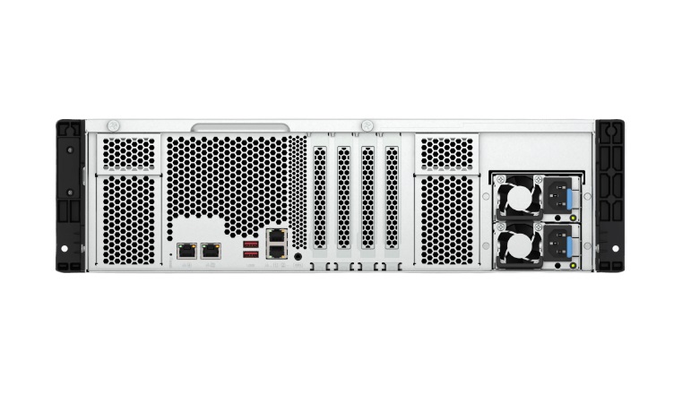 Połącz model TS-h1677AXU-RP z jednostkami rozbudowy SAS 12 Gb/s, PCIe 64 Gb/s lub SATA 6 Gb/s na potrzeby uzyskania pojemności pamięci masowej na poziomie petabajtów.