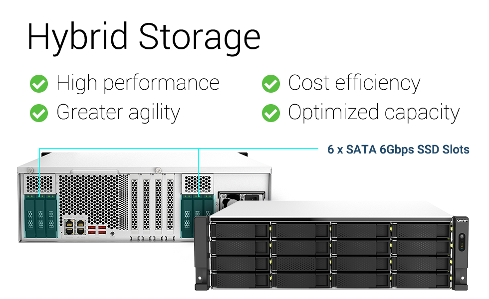 W porównaniu z tradycyjnymi macierzami pamięci masowej, hybrydowa pamięć masowa TS-h2287XU-RP równoważy koszty, wydajność i pojemność. Dzięki szesnastu 3,5-calowym wnękom SATA 6 Gb/s na dyski twarde oraz sześciu 2,5-calowym gniazdom na dyski SSD SATA 6 Gb/s, model TS-h2287XU-RP obsługuje buforowanie dysków SSD, poprawiając obciążenia IOPS przy dostępie do ważnych danych.