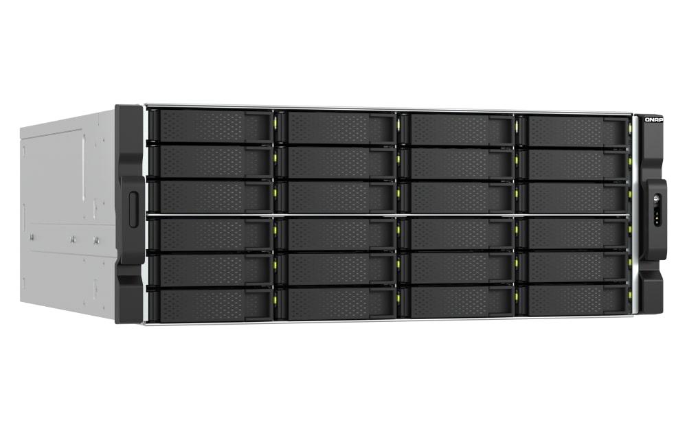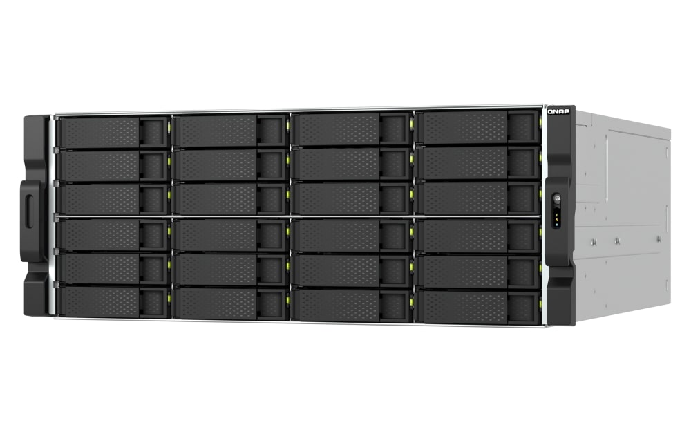 TS-h2477AXU-RP, wyposażony w 24 × 30 TB dyski, zapewnia do 600 TB pojemności Pamięć masowa. Możesz dodatkowo rozbudować system, podłączając wiele wysokowydajnych jednostek rozszerzających QNAP JBOD, które obsługują dyski SAS lub SATA. Na przykład, podłączenie 8 × 24-wnękowych jednostek PCIe JBOD TL-R2400PES-RP dodaje 192 dodatkowe dyski, eliminując obawy dotyczące pojemności Pamięć masowa.