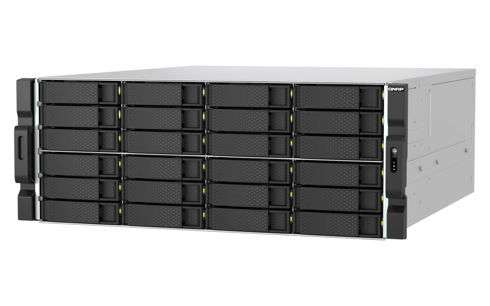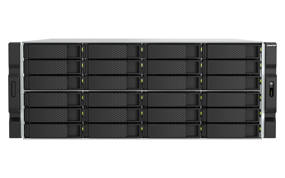 TS-h2477AXU-RP, wyposażony w 24 × 30 TB dyski, zapewnia do 600 TB pojemności Pamięć masowa. Możesz dodatkowo rozbudować system, podłączając wiele wysokowydajnych jednostek rozszerzających QNAP JBOD, które obsługują dyski SAS lub SATA. Na przykład, podłączenie 8 × 24-wnękowych jednostek PCIe JBOD TL-R2400PES-RP dodaje 192 dodatkowe dyski, eliminując obawy dotyczące pojemności Pamięć masowa.