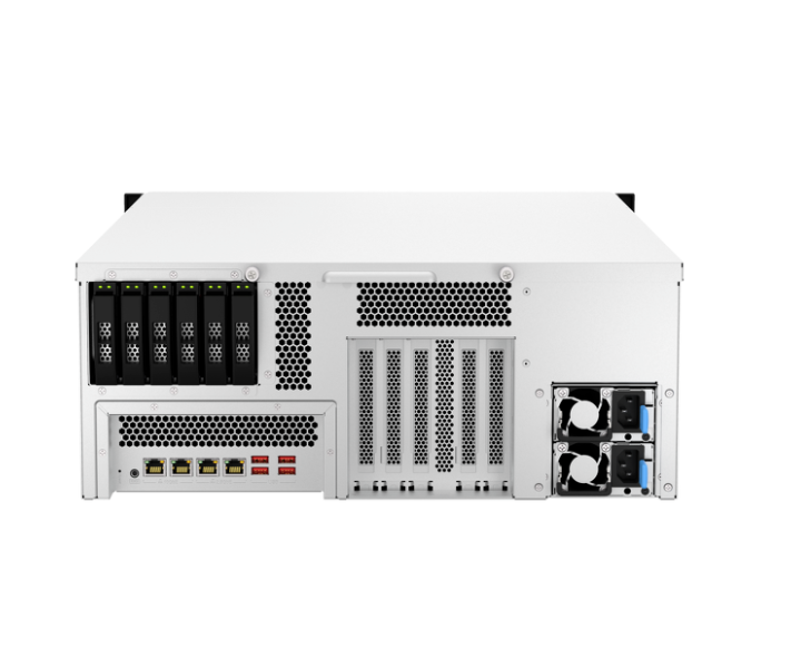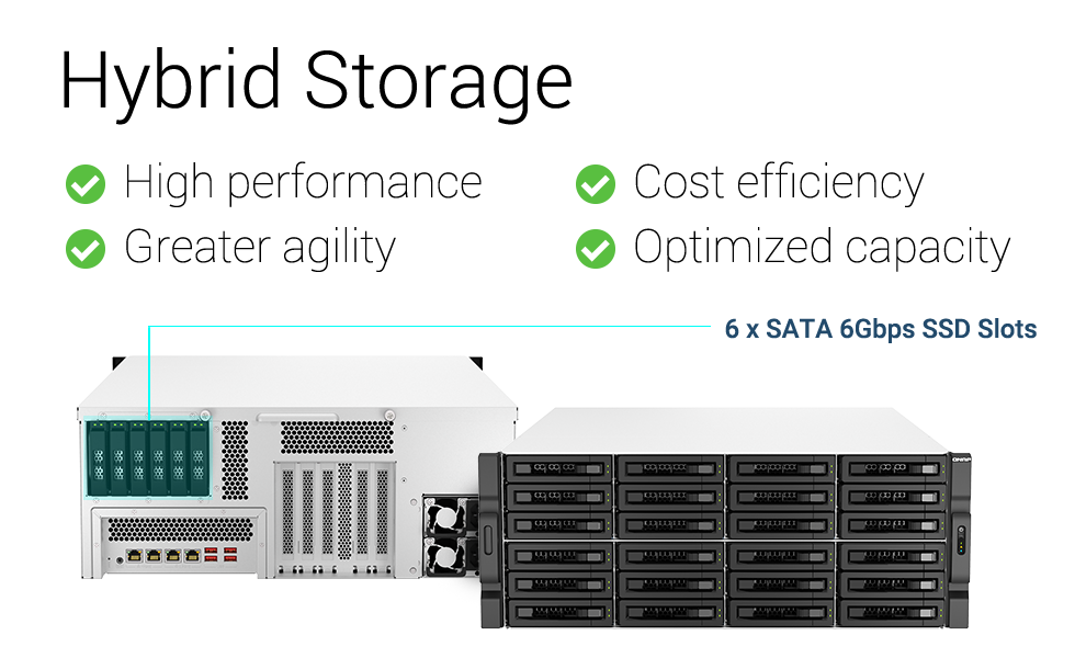 W porównaniu z tradycyjnymi macierzami pamięci masowej, hybrydowa pamięć masowa TS-h3087XU-RP równoważy koszty, wydajność i pojemność. Dzięki dwudziestu czterem 3,5-calowym wnękom SATA 6 Gb/s na dyski twarde oraz sześciu 2,5-calowym gniazdom na dyski SSD SATA 6 Gb/s, model TS-h3087XU-RP obsługuje buforowanie dysków SSD, poprawiając obciążenia IOPS przy dostępie do ważnych danych.