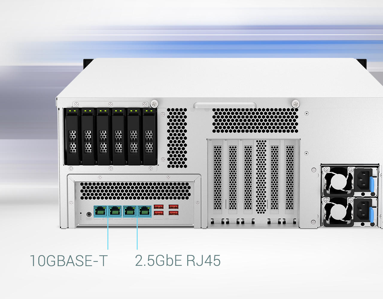 Dwa porty 10GBASE-T i dwa porty 2,5GbE przyspieszają wirtualizację, intensywny dostęp do plików i zadania w zakresie tworzenia kopii zapasowych/przywracania danych.