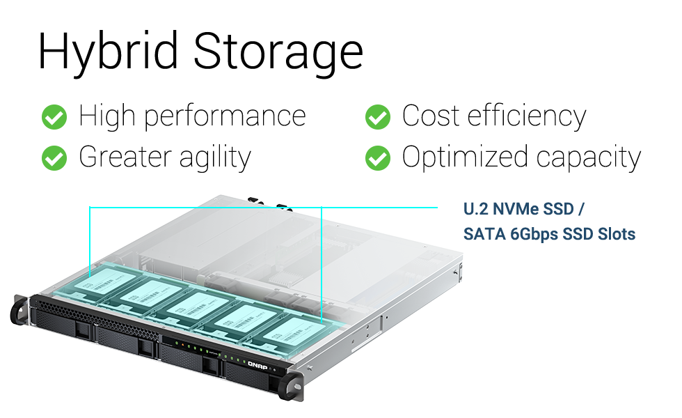 W porównaniu z tradycyjnymi macierzami pamięci masowej, hybrydowa pamięć masowa TS-h987XU-RP montowana na stelażu 1U równoważy koszty, wydajność i pojemność. Dzięki czterem 3,5-calowym wnękom SATA 6 Gb/s na dyski twarde oraz pięciu 2,5-calowym gniazdom na dyski SSD U.2 NVMe PCIe Gen 4 x4 (64 Gb/s), TS-h987XU-RP obsługuje buforowanie dysków SSD, poprawiając obciążenia IOPS przy dostępie do ważnych danych.