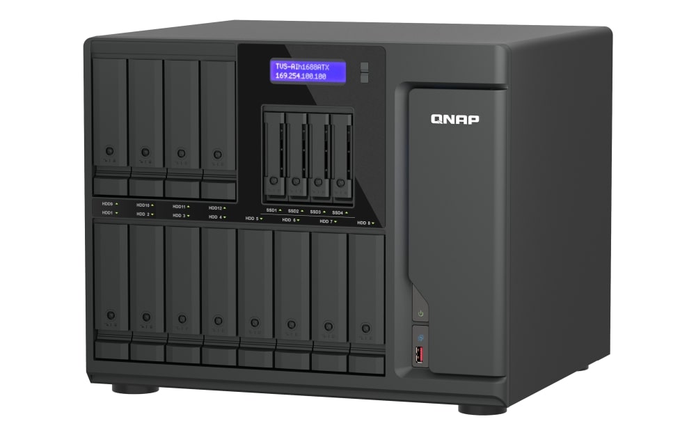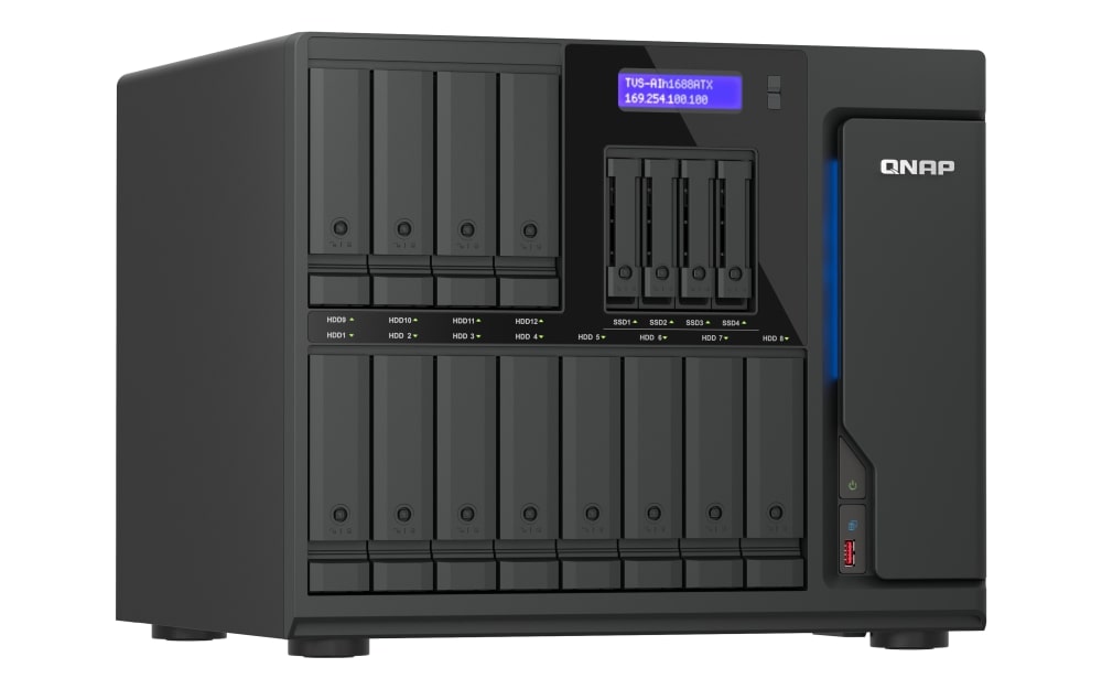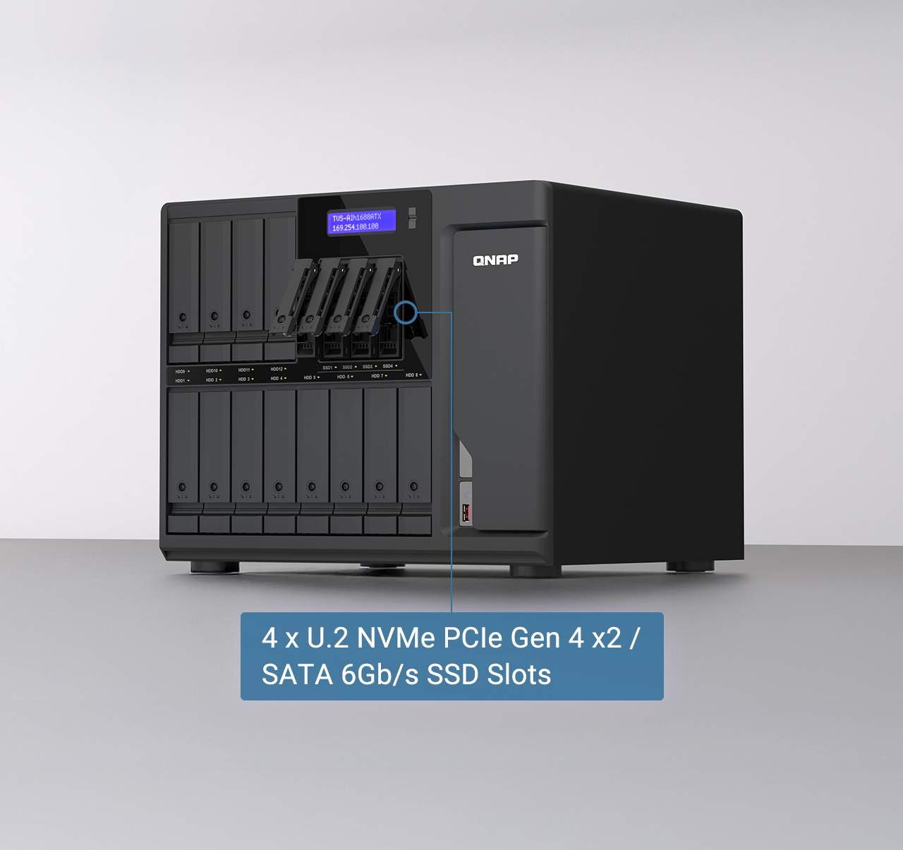 TVS-AIh1688ATX posiada cztery gniazda 2,5-calowe SSD obsługujące wysokowydajne U.2 NVMe PCIe Gen 4 x2 SSD (do 32 Gb/s na gniazdo) lub ekonomiczne SATA 6Gb/s SSD. Połączenie z ultraszybkimi U.2 NVMe SSD znacząco zwiększa wydajność w zadaniach wymagających niskich opóźnień i dużej intensywności, takich jak aplikacje AI, Wirtualizacja oraz przetwarzanie Multimedia.
