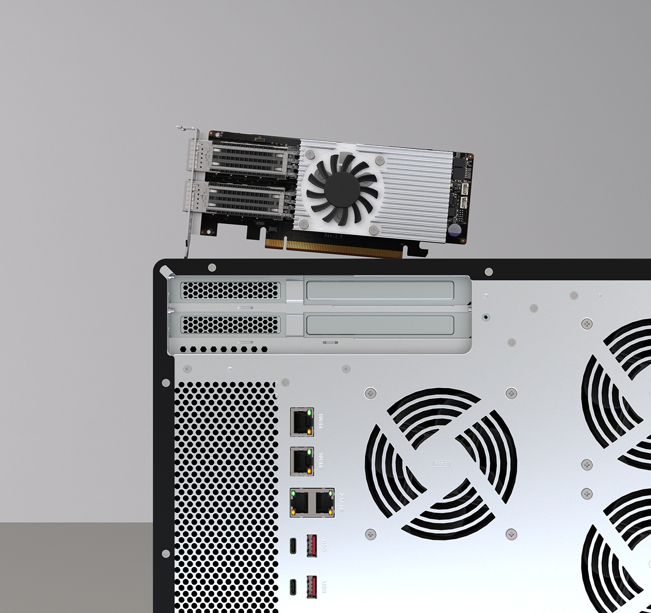 Rozszerz przez karty PCIe do 25/100GbE, idealne dla Wirtualizacja, intensywnego dostępu do plików, transferu multimediów oraz szybkiego backupu/przywracania.