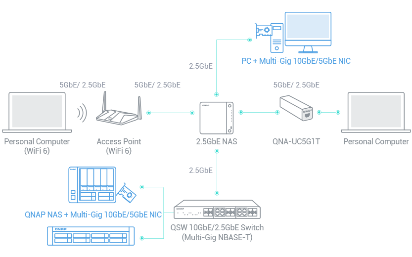 Firma QNAP oferuje szeroką gamę rozwiązań sieciowych po przystępnej cenie, w tym przejściówki i karty rozszerzeń, dzięki czemu serwer NAS, laptopy i komputery stacjonarne mogą w łatwy sposób uzyskać dodatkową funkcję bardzo szybkiej sieci.