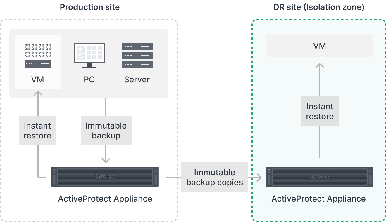 Skonfiguruj swoją lokalizację kopii zapasowej za pomocą urządzeń Synology ActiveProtect (seria DP). Te urządzenia są wyposażone w niezawodny system operacyjny, ActiveProtect Manager (APM), który umożliwia bezproblemowe tworzenie kopii zapasowych i przywracanie, upraszczając proces ochrony danych.