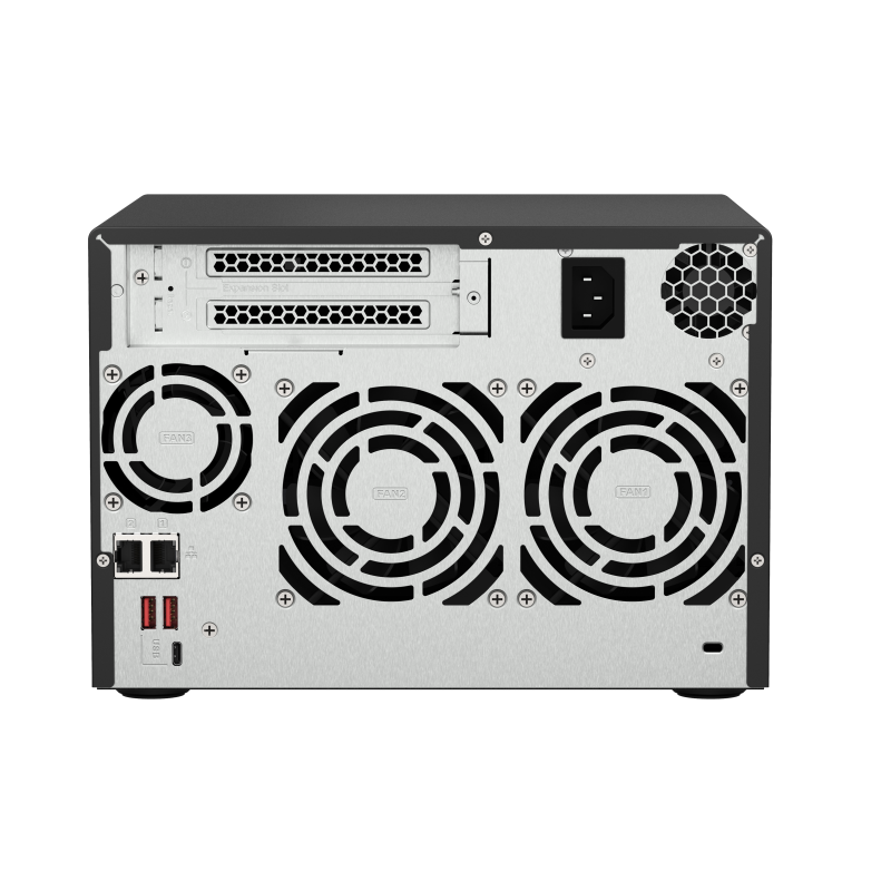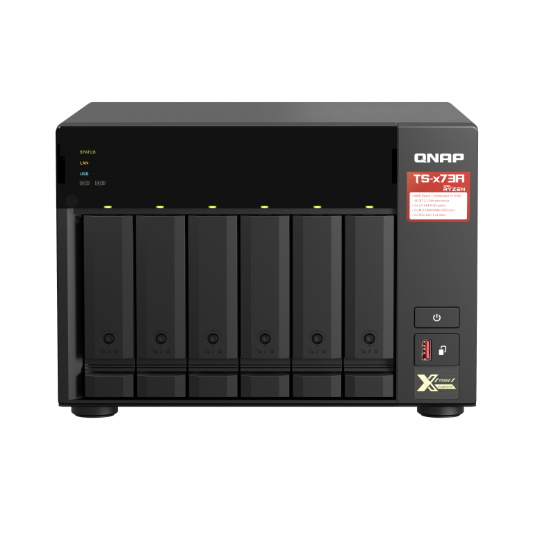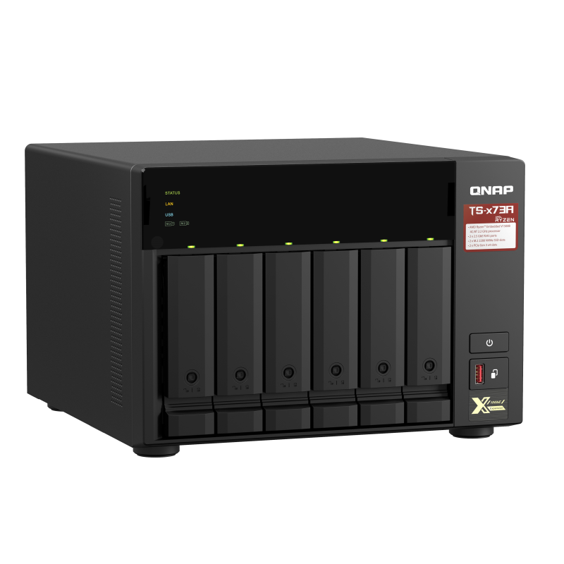 Featuring an AMD Ryzen™ V1000 series V1500B quad-core processor that delivers great system performance with up to quad-core / 8 threads and Turbo Core up to 2.2 GHz. The TS-673A features two 2.5GbE RJ45 ports and two PCIe Gen 3 slots for you to flexibly deploy 5GbE/10GbE networks. Two M.2 NVMe SSD slots for Qtier Technology and SSD Caching enable constant storage optimization. The TS-673A supports QTS and QuTS hero, allowing users to flexibly switch operating system based on their requirements.